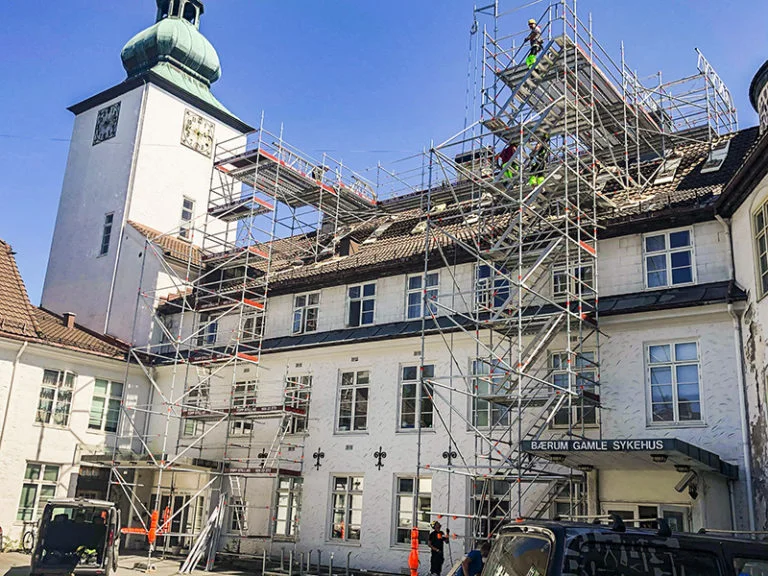 Supply and installation of access scaffolding and temporary roof protection for Bærum Hospital, delivered for KF ENTREPRENØR AS.